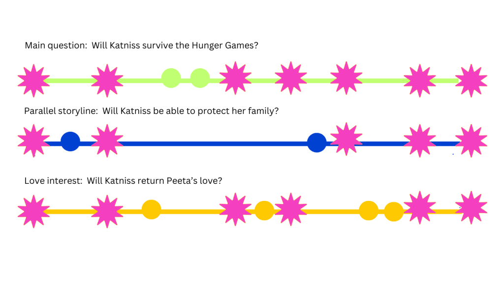 Part of a character arc can go one way, while another part goes another way. The MC’s romantic arc may be dipping, and at the same time, his arc for his professional business may be climbing. Plot your arcs on a timeline for each: the story and the characters. Sub-plots make small arcs inside the big one. See the diagram below that shows Katniss’s timeline for the Hunger Games, including her arcs for family and romance. Notice how they don’t seem to have a pattern– That’s for the overall story arc.