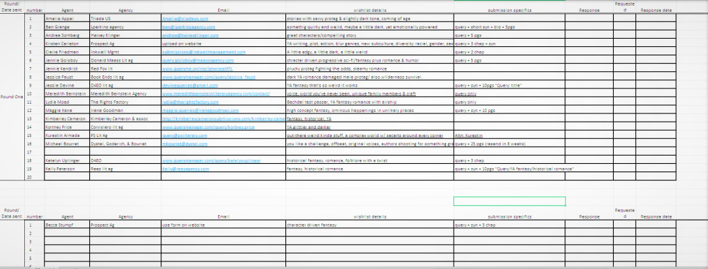 First, before you get to researching anything, you will learn that as an author, you need to record everything. (Self-publishers are still in the editing/beta phase, too, so they don’t have to worry about this part.) If you will be querying, however, you want to make a spreadsheet. It can say whatever you want, but here’s how I do mine: