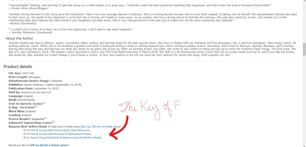 There are ways to do that, as well. Keywords and categories are mega important. I let my publisher just pick random categories and keywords like: fantasy, magic, wizards, mages, sword-fighting. NO. The keywords or “keyword phrases” that you are allowed to provide are the keyword phrases that people use when they are searching for your book. I’m trying to think of a few of mine. Strong female hero, YA college romance, epic adventure quest, young adult contemporary fantasy, YA alpha romance.