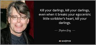 5| Speaking of cutting words you like, have you ever heard the quote, “kill your darlings,“ and not known what it meant? It means to cut words you love. I always thought it meant killing characters. And sometimes, that’s the case, but more than that, it means sometimes you write the best, most descriptive, beautiful, intelligent, emotional paragraph that is right in the middle of an action scene, and you have to cut it. You don’t want to–you really like that paragraph–it shows your writing chops. But, “If it impedes the flow, it’s got to go.” (Made that quote up myself. Lol.)